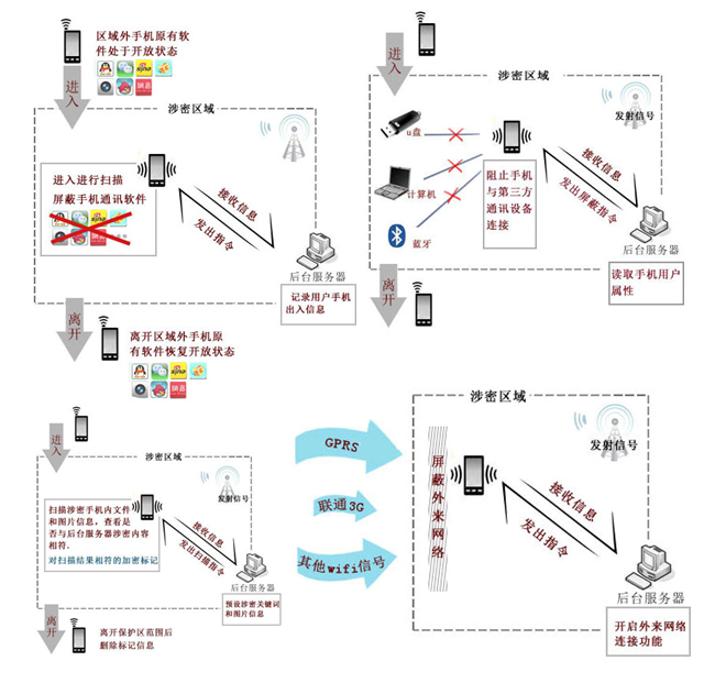 在內部手機管控的同時,還可搭配手機探測系統實現對外來人員以及外部手機防帶入的管理,達到信息絕對安全的硬性需求